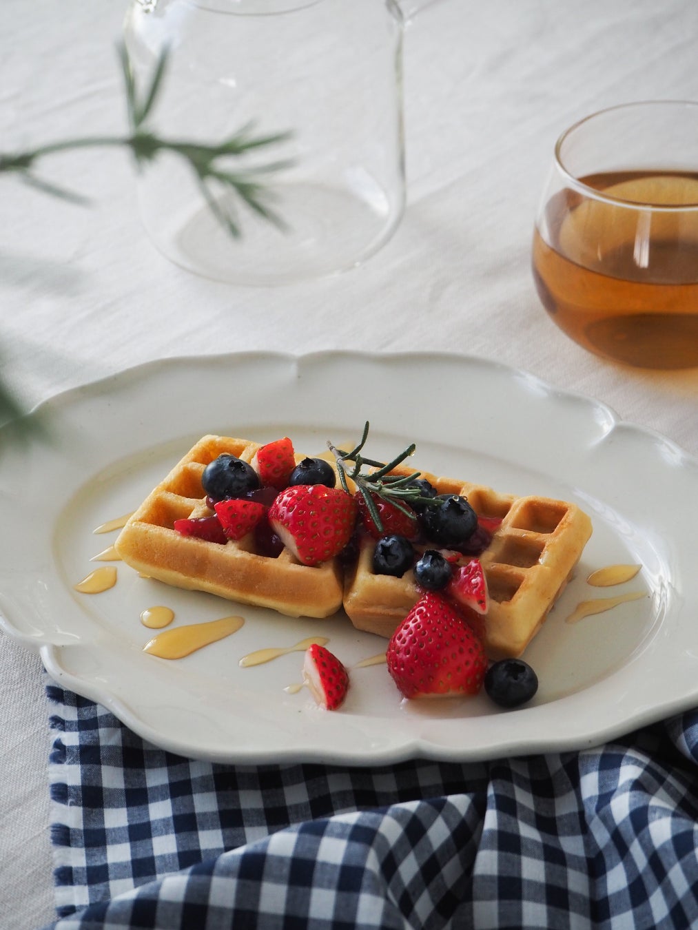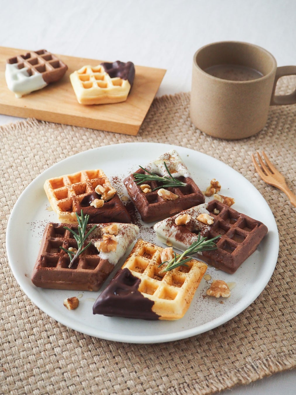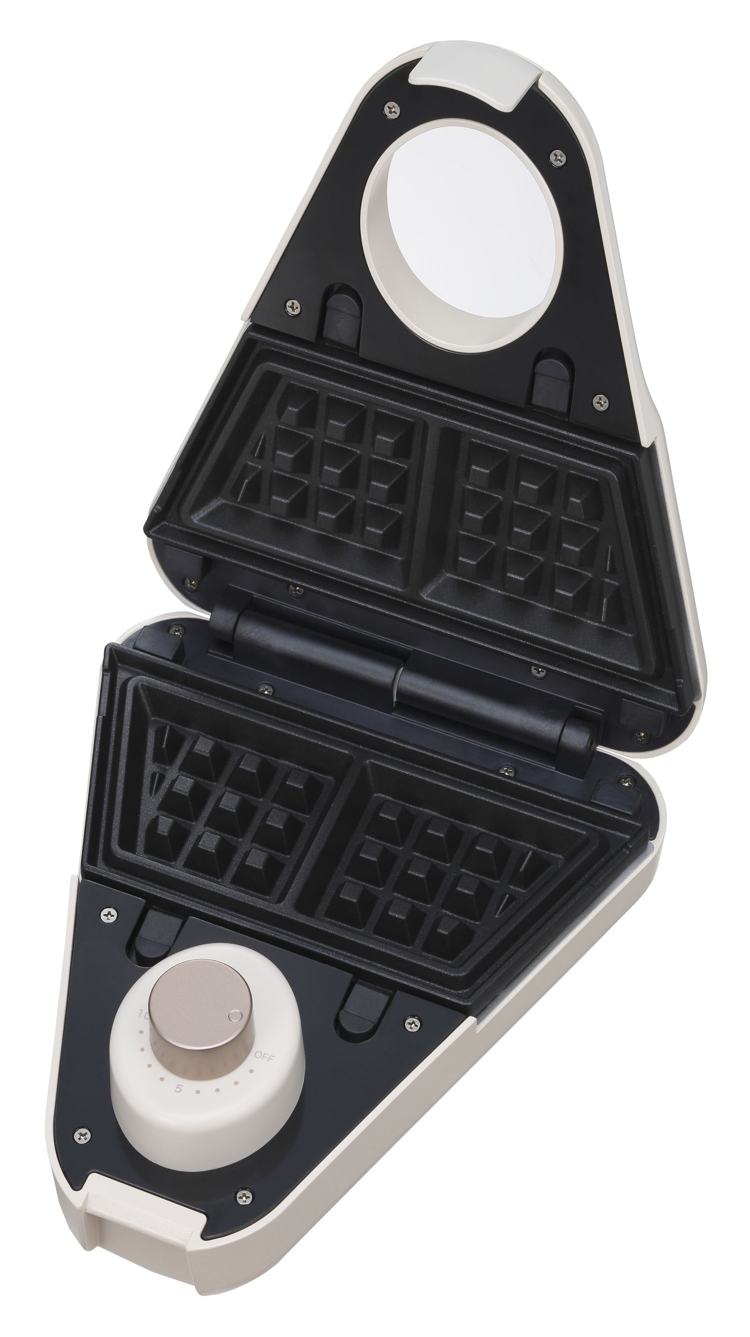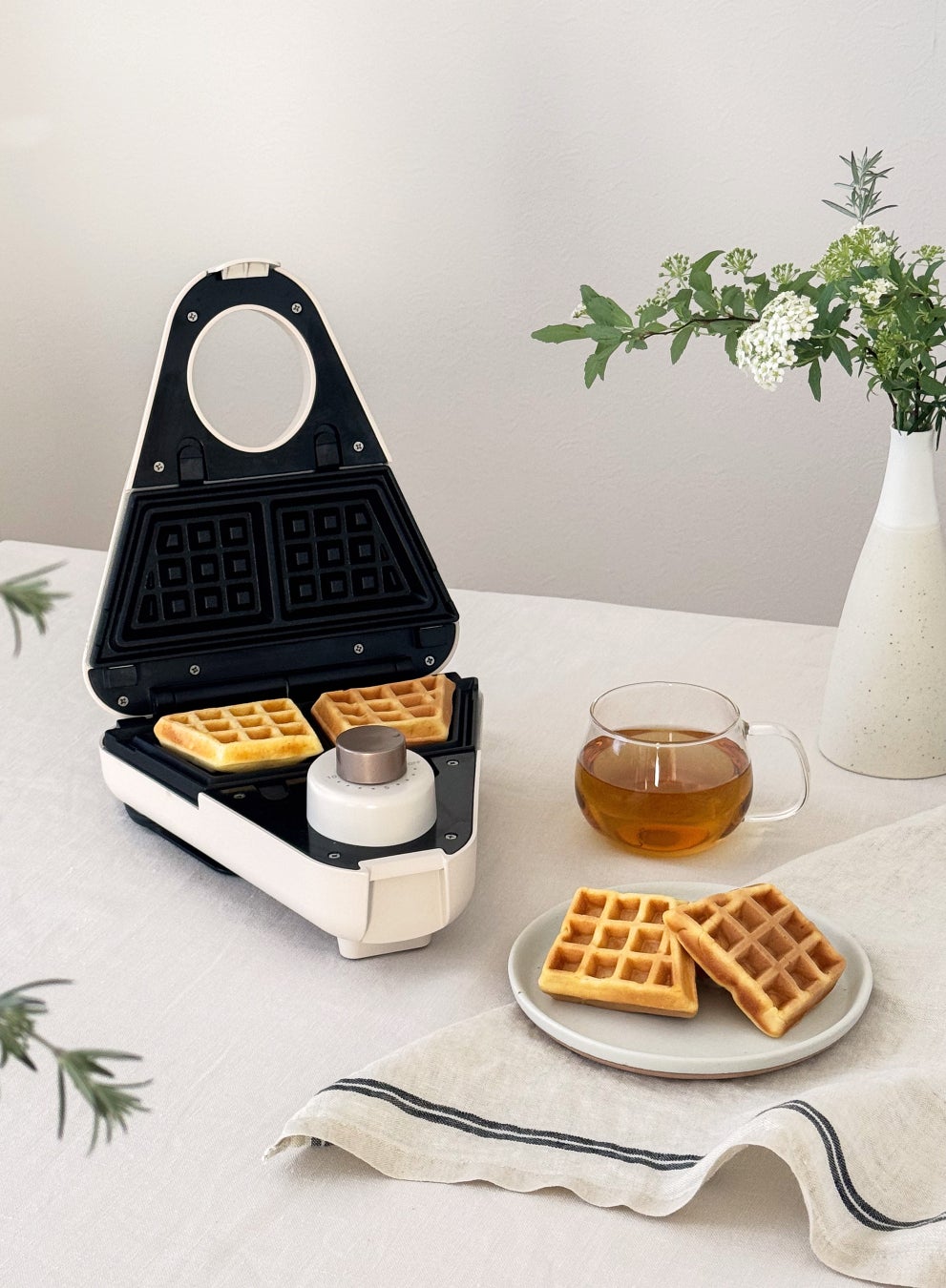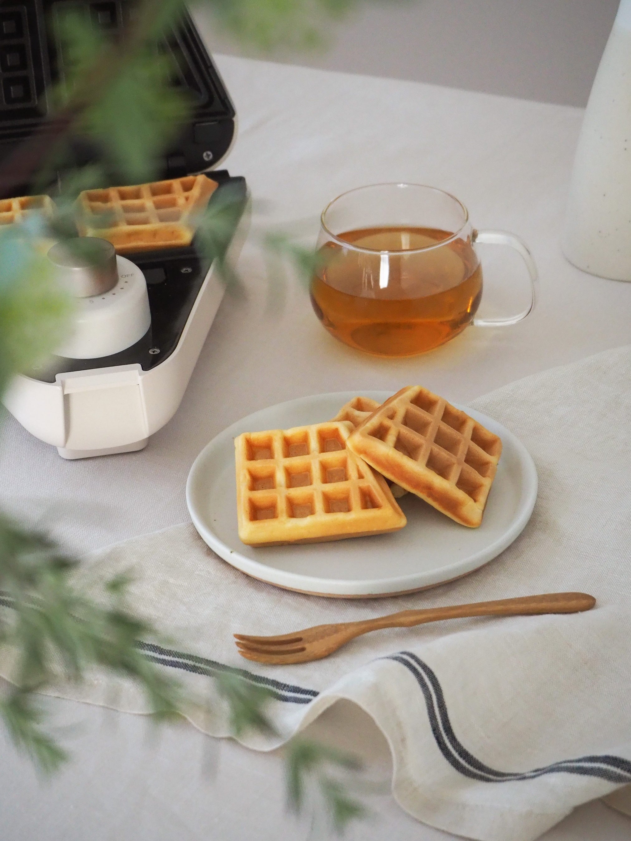ワッフルプレートは、片手サイズのミニワッフルが2枚焼ける仕様です。市販のパンケーキミックスを使用して表面サクサク中ふんわりのカフェ風ワッフルが仕上がります。仕上げにベリーやシロップ、チョコレートをかけるトッピングアレンジはもちろん、生地にココアや抹茶パウダーを混ぜ込んで焼きあげるのもお勧めです。