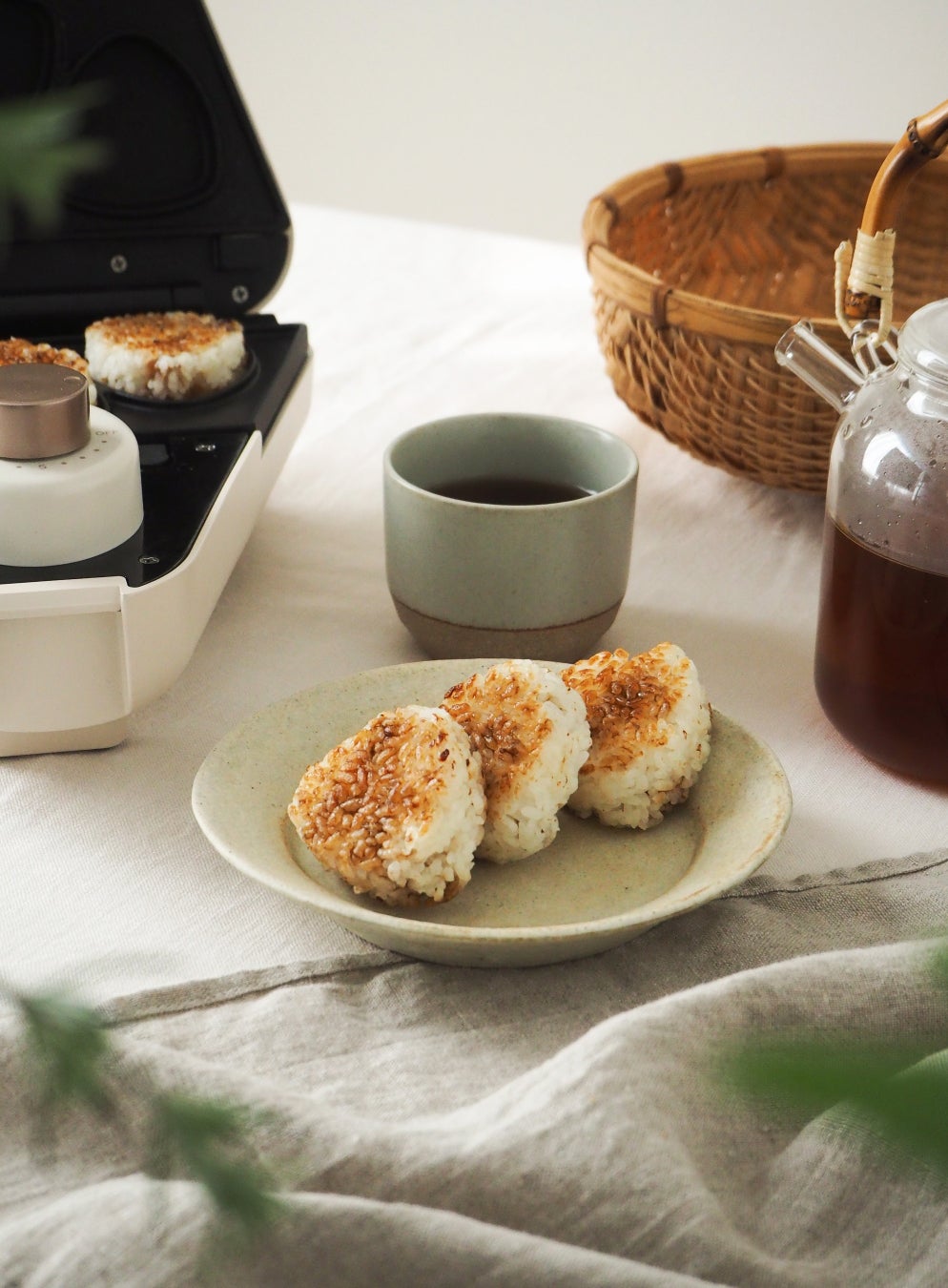 今回新たに発売したプレートでは「焼きおにぎり」「ワッフル」が作れます。焼きおにぎりプレートでは一辺約5cmのミニサイズの焼きおにぎりが3つ作れます。ご自宅で余ったご飯をおにぎりにし、醬油だれをたっぷり塗ったら蓋を閉じて約10分。醤油の芳ばしい香りが食欲をそそります。