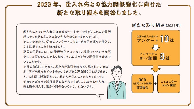 まず、昨年第三者意見で「サプライチェーンの重要なプレーヤーである取引先(仕入先)に対する取り組みも明示していく必要がある」とのご意見をいただいたことから、「OMOU 2023」作成に先立ち、社員が仕入先を訪問する取り組みを始めました。これにより、これまで電話でしかお話したことがなかった仕入先の皆様とも、温かい関係性を築いていく第一歩になったと考えます。