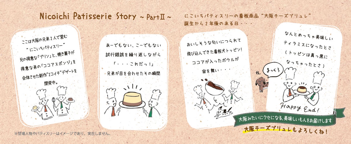 そんな大阪ティラミスは、にこいちパティスリー※の新商品。パティスリーの兄弟2人と飼い犬トッピンに