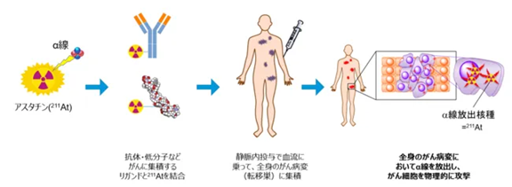 標的アルファ線核医学治療は、アルファ線を放出する物質とがんに集積する物質を結合し体内に注入することにより全身のがんを攻撃する治療法です。