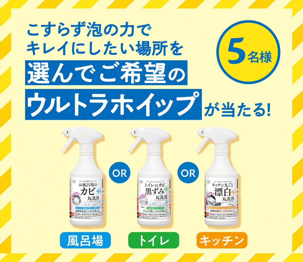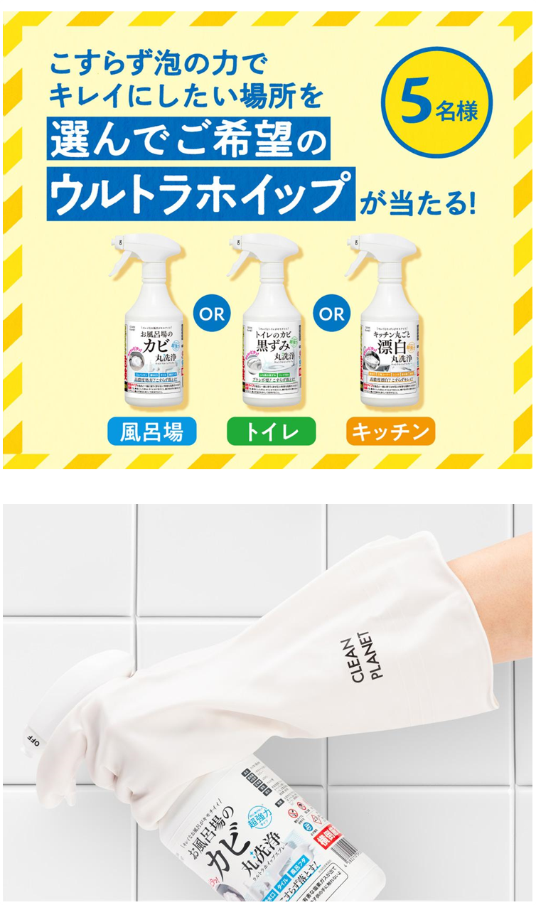 第1弾では、お家の年末大掃除に役立つ「年末お掃除根こそぎ5点セット」を3名様に。第2弾では「ウルトラホイップスプレー 3種(お風呂場・トイレ・キッチン)のうちいずれか1点」を5名様にプレゼント。Wチャンスとして、オリジナルのゴム手袋をプレゼントいたします。本キャンペーンは、クリーンプラネット公式Xをフォローし、対象の投稿に記載の質問に答えてポストすることでどなたでも応募いただけます。