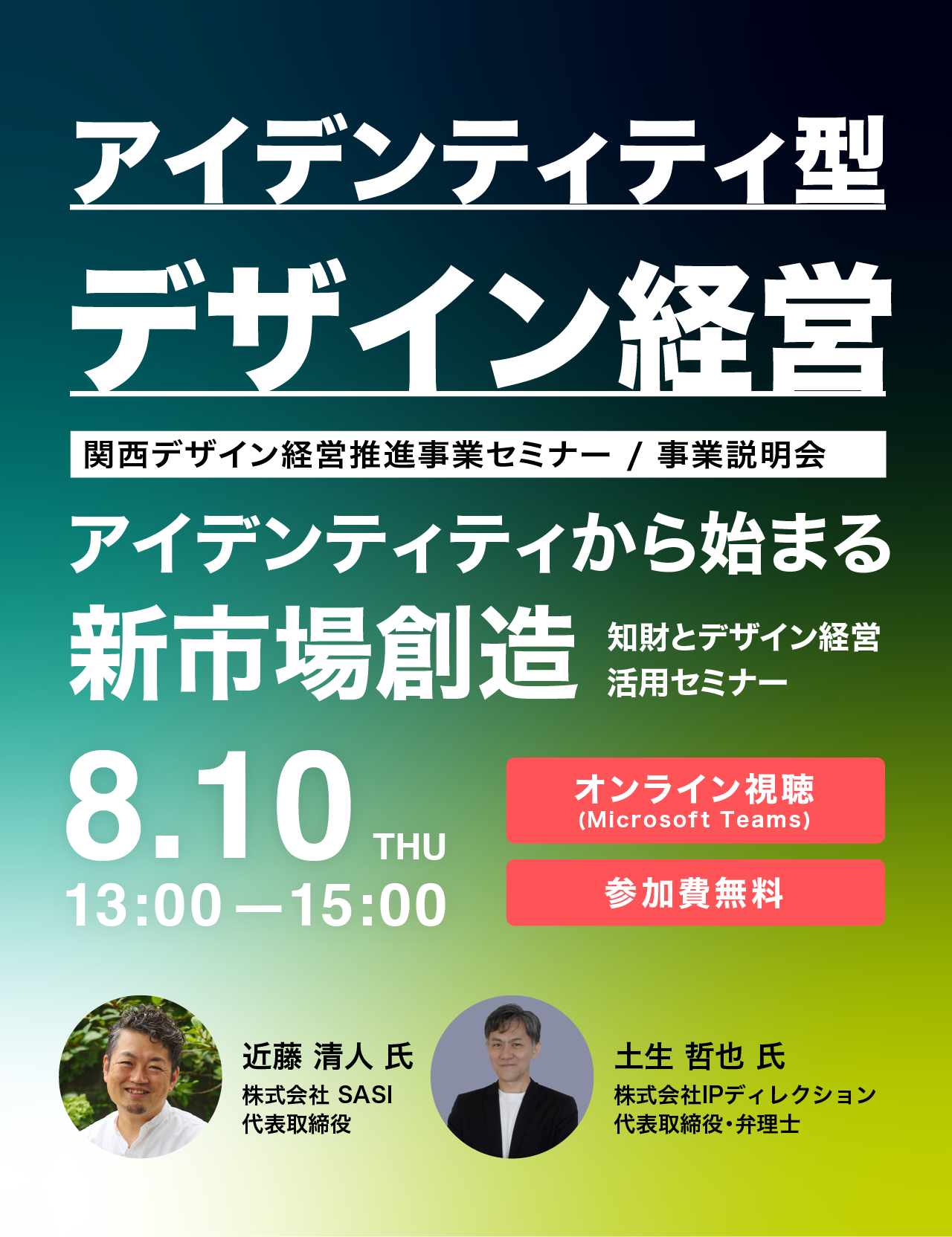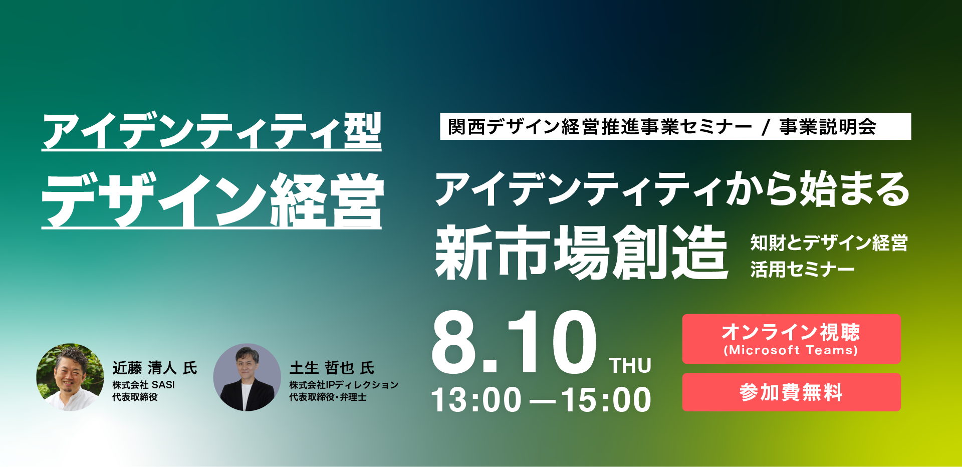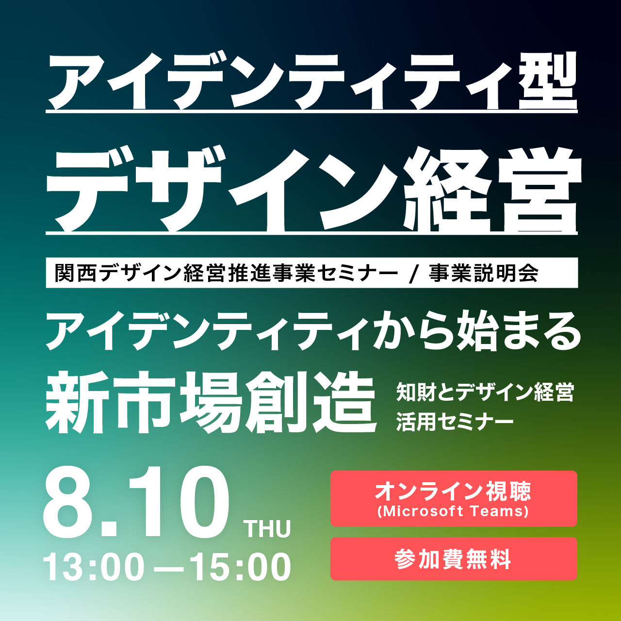 8月10日(木)アイデンティティから始まる新市場創造~知財とデザイン経営活用セミナー~のオンラインセミナーを開催。参加対象者:デザイン経営に興味のある中小企業者、金融機関、自治体、支援機関等