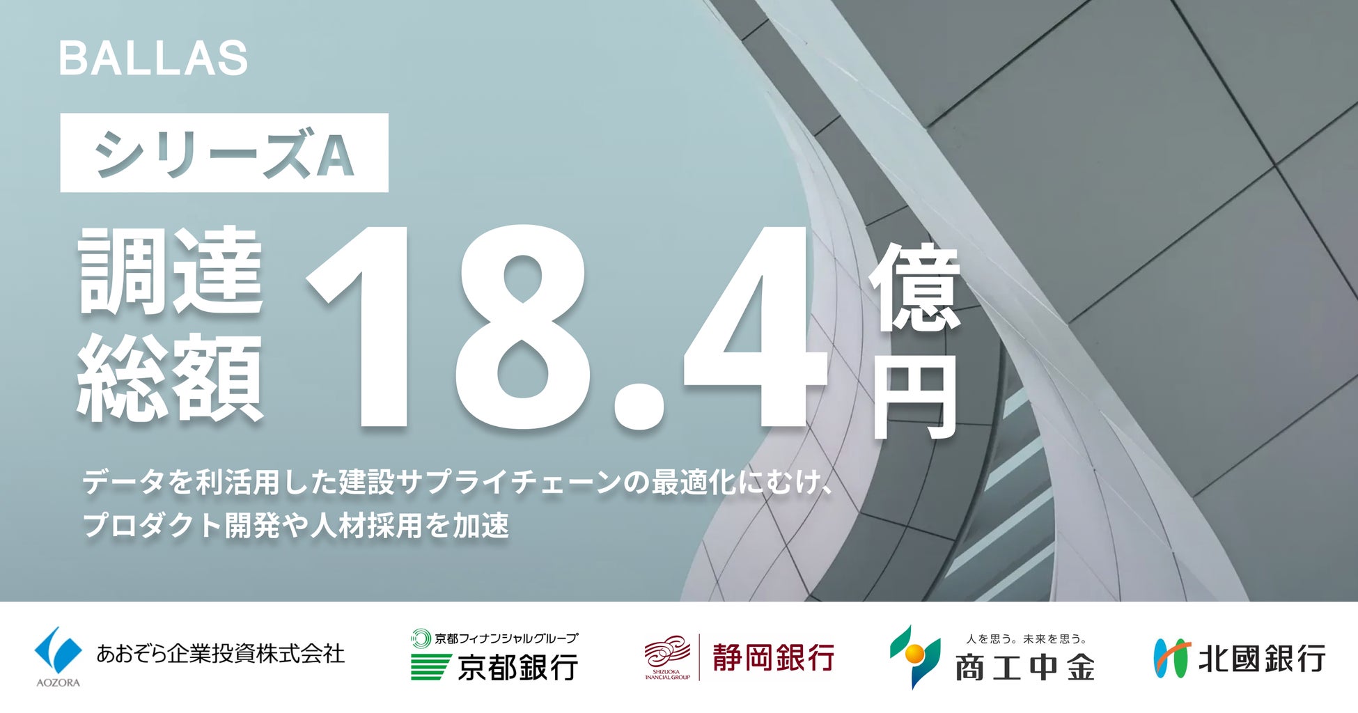 建設部材の最適な調達から生産性と創造性の両立に取り組む株式会社BALLAS(代表取締役:木村将之、本社:東京都中央区、以下「BALLAS」)はシリーズAにて、エクイティ11.6億円に加えてデット6.8億円を調達し、シリーズA総額18.4億円の資金調達を完了いたしました。