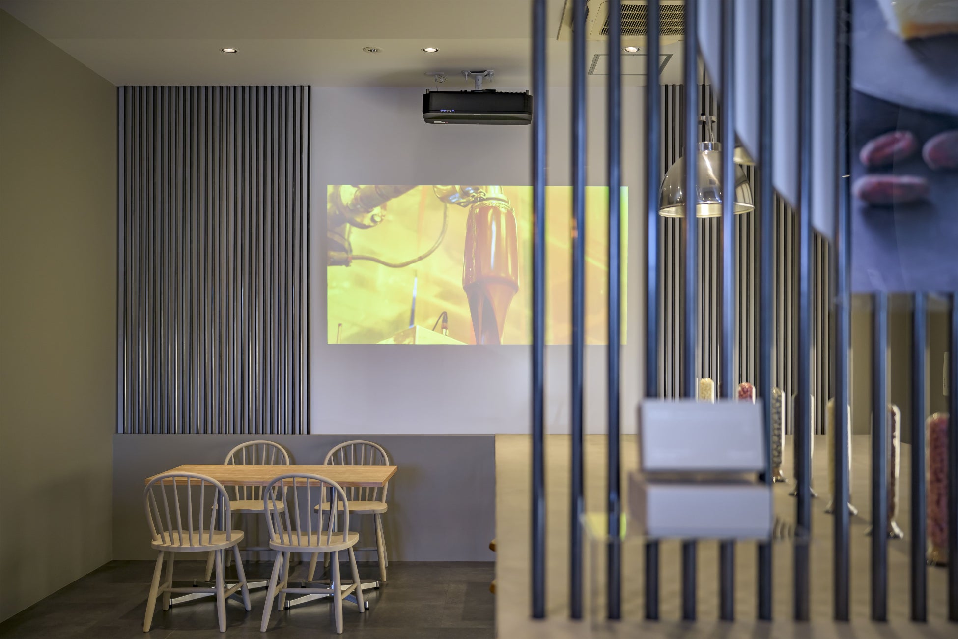 イートインコーナーでは、カカオ農園やチョコレート工場の映像が大画面で流れています。