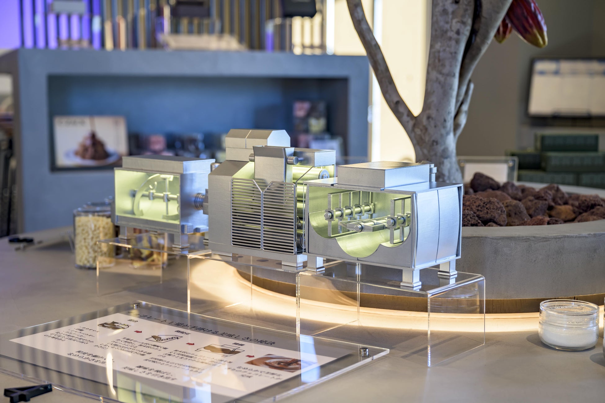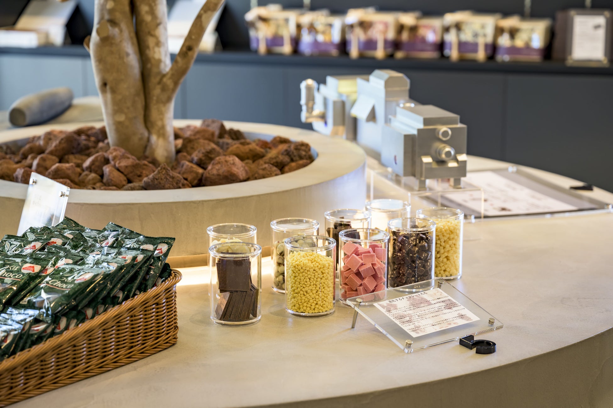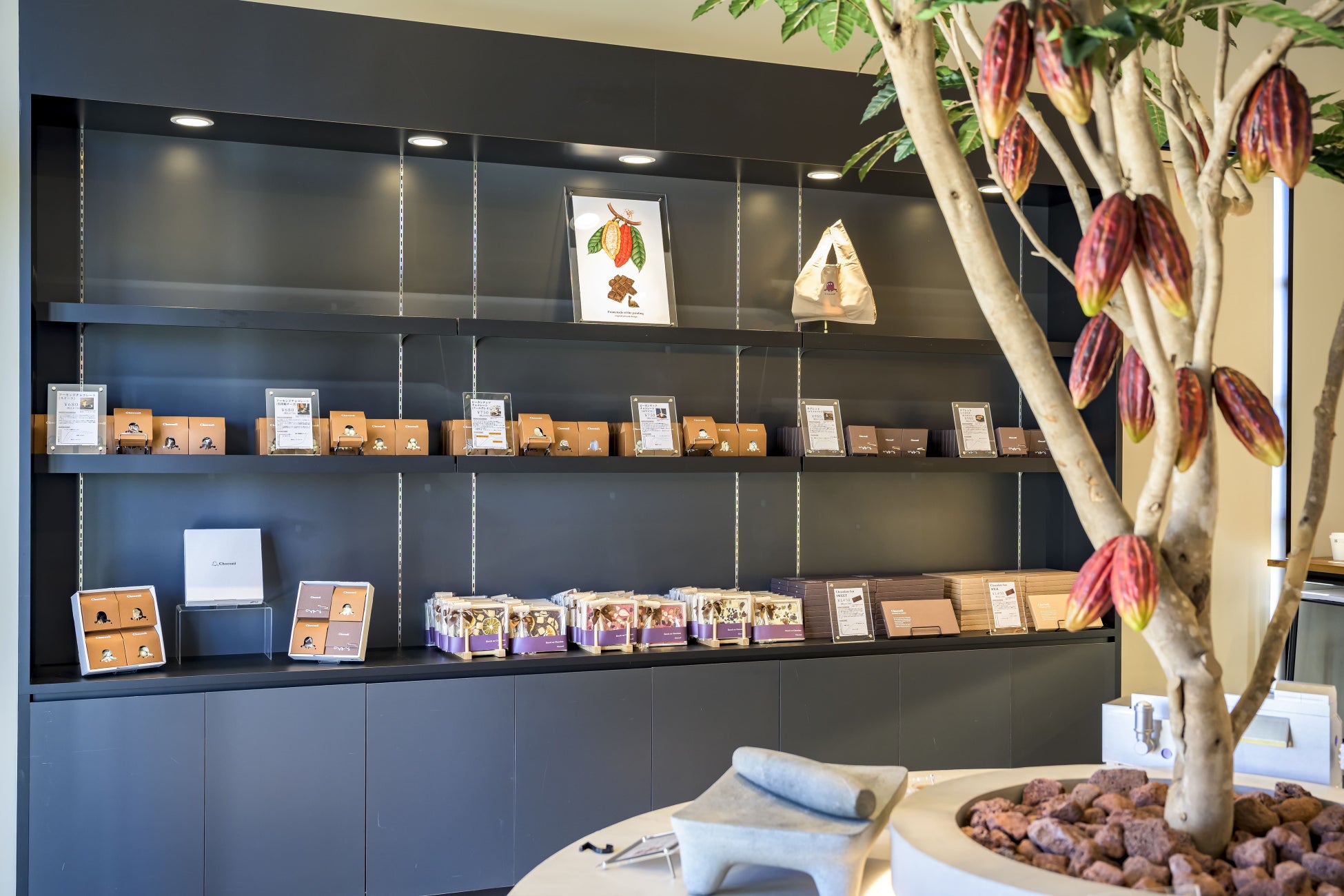 お店に入った瞬間、目の前に広がるのはカカオの樹から始まるチョコレートの旅路です。カカオの樹や実がどういうものか、どんな変化や過程を経てチョコレートに変わっていくのかが展示されています。