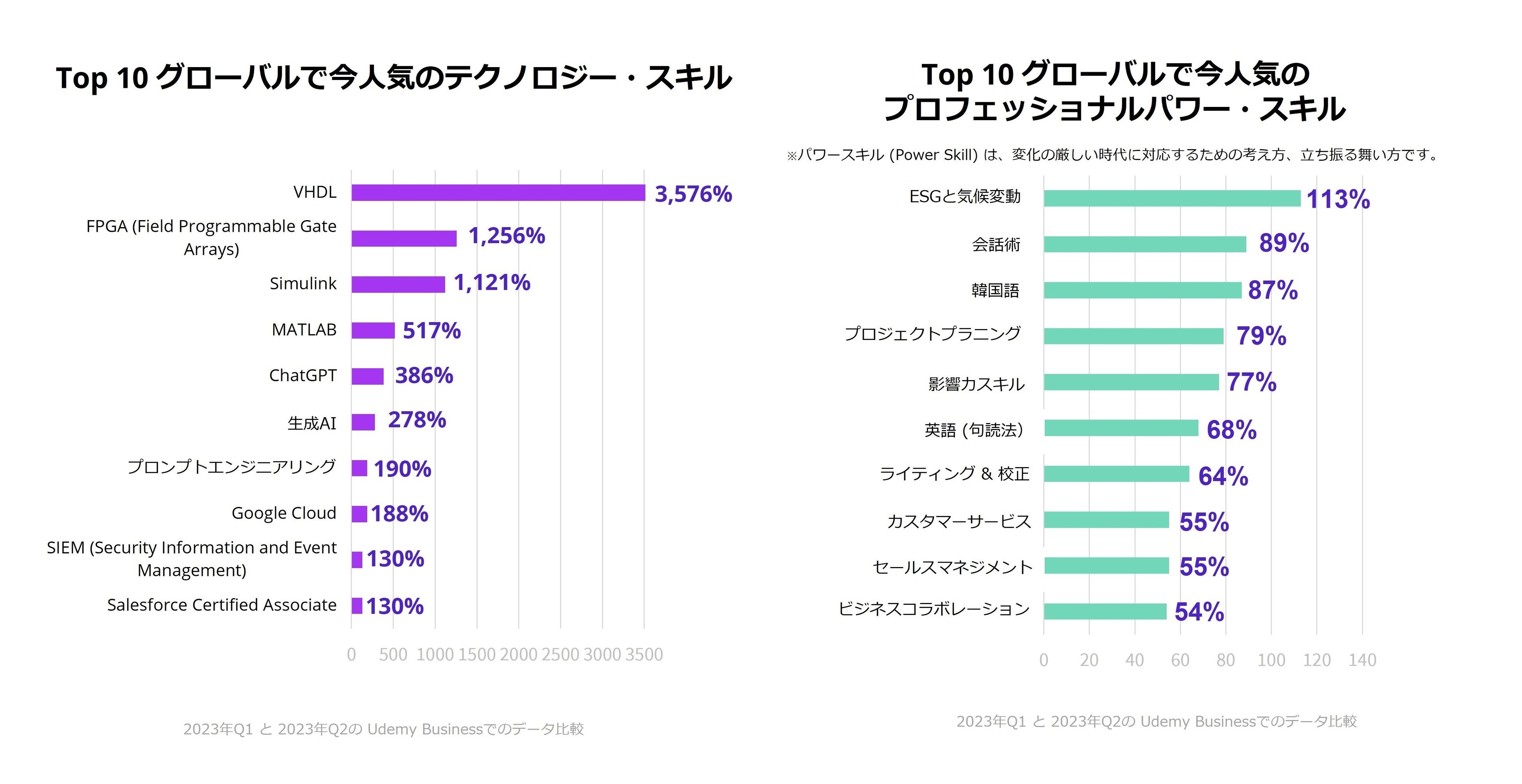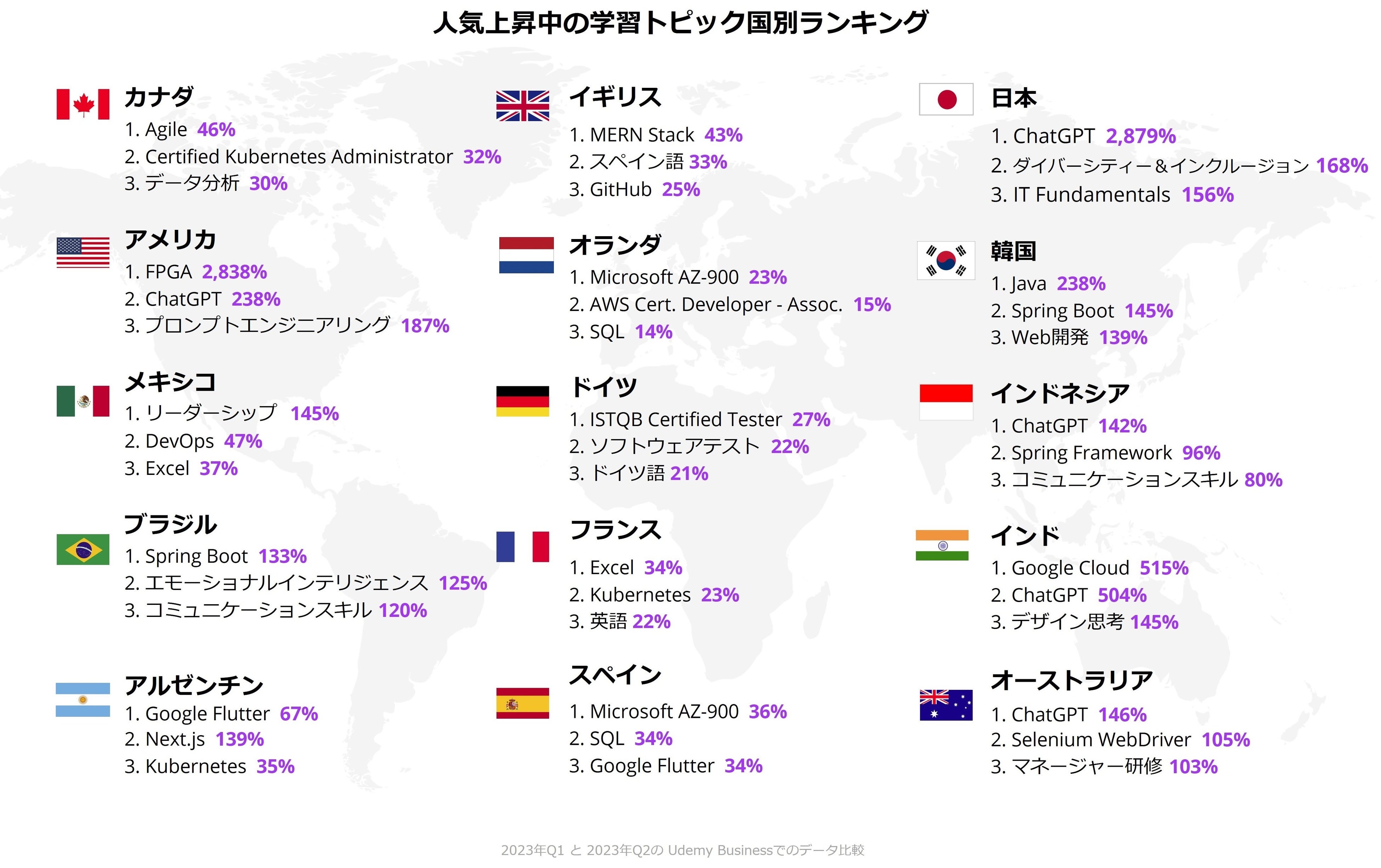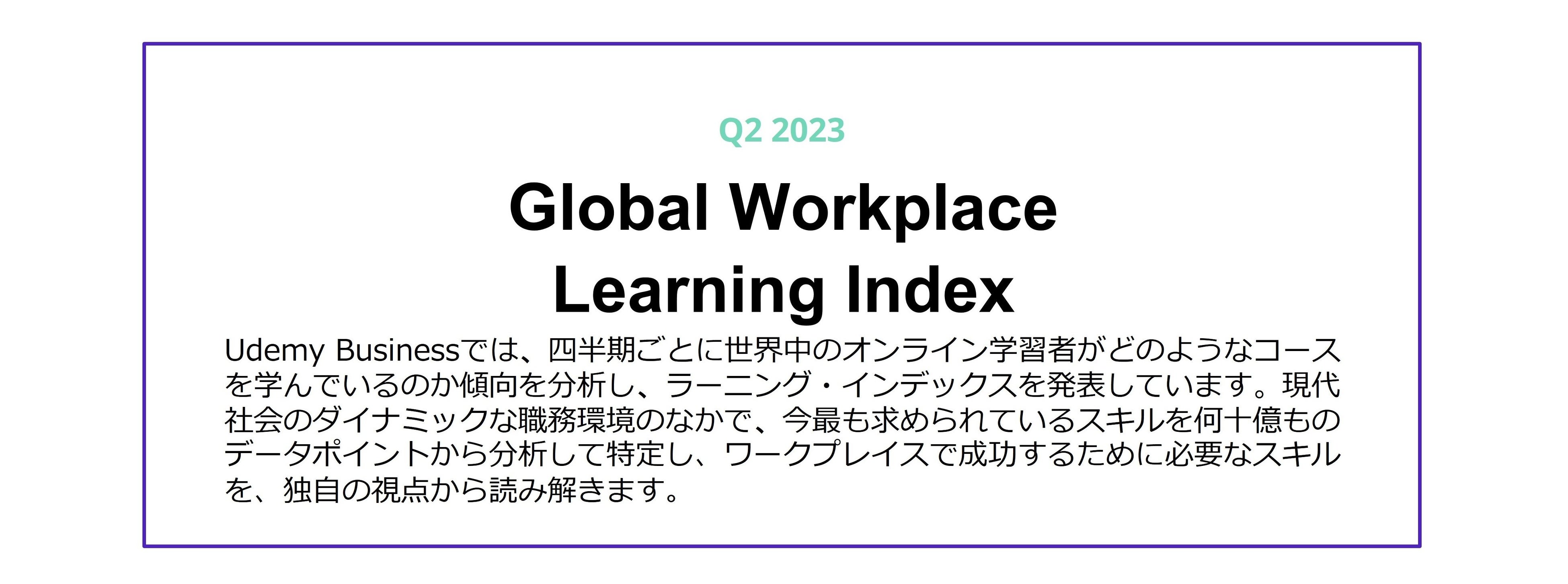 オンライン学習を通じて人々の生活の向上を目指すUdemyは本日、「2023年第2四半期 ワークプレイス・ラーニングインデックス」を発表し、テクノロジースキルとプロフェッショナルパワースキルで日本および世界中の高い専門知識を有した学習者が最も学んでいるスキルを明らかにしました。