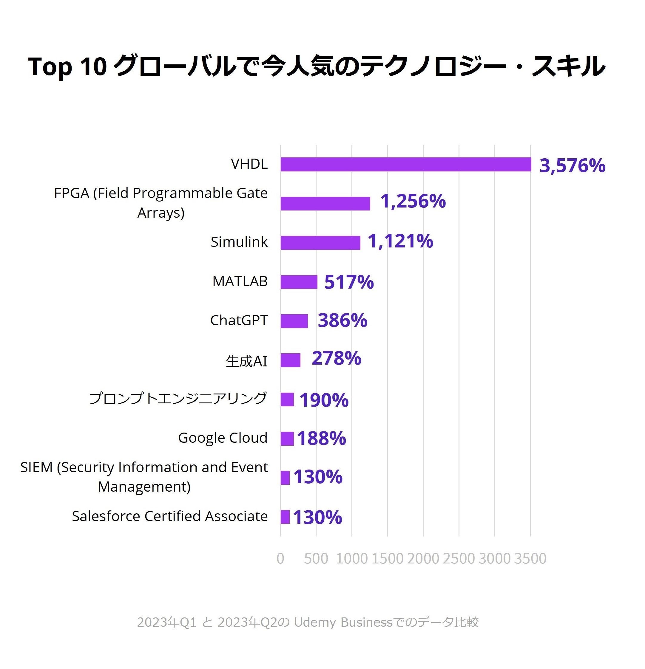 世界で最も人気だったテクノロジー・スキルでは、半導体や半導体チップ製造に関連する講座への注目が高まっています。電子設計の自動化などで利用されているハードウェア記述言語「VHDL(Very High-Speed Integrated Circuit Hardware Description Language)」が前期比3,576%増で1位、プログラミングが可能なCLB(Configurable Logic Blocks)で設計された半導体デバイスの集積回路の一種「FPGA(Field Programmable Gate Arrays)」が前期比1,256%増で2位、シミュレーションなどで活用されるMATLABベースのプログラミング環境の「Simulink」が前期比1,121%増で3位という結果になりました。