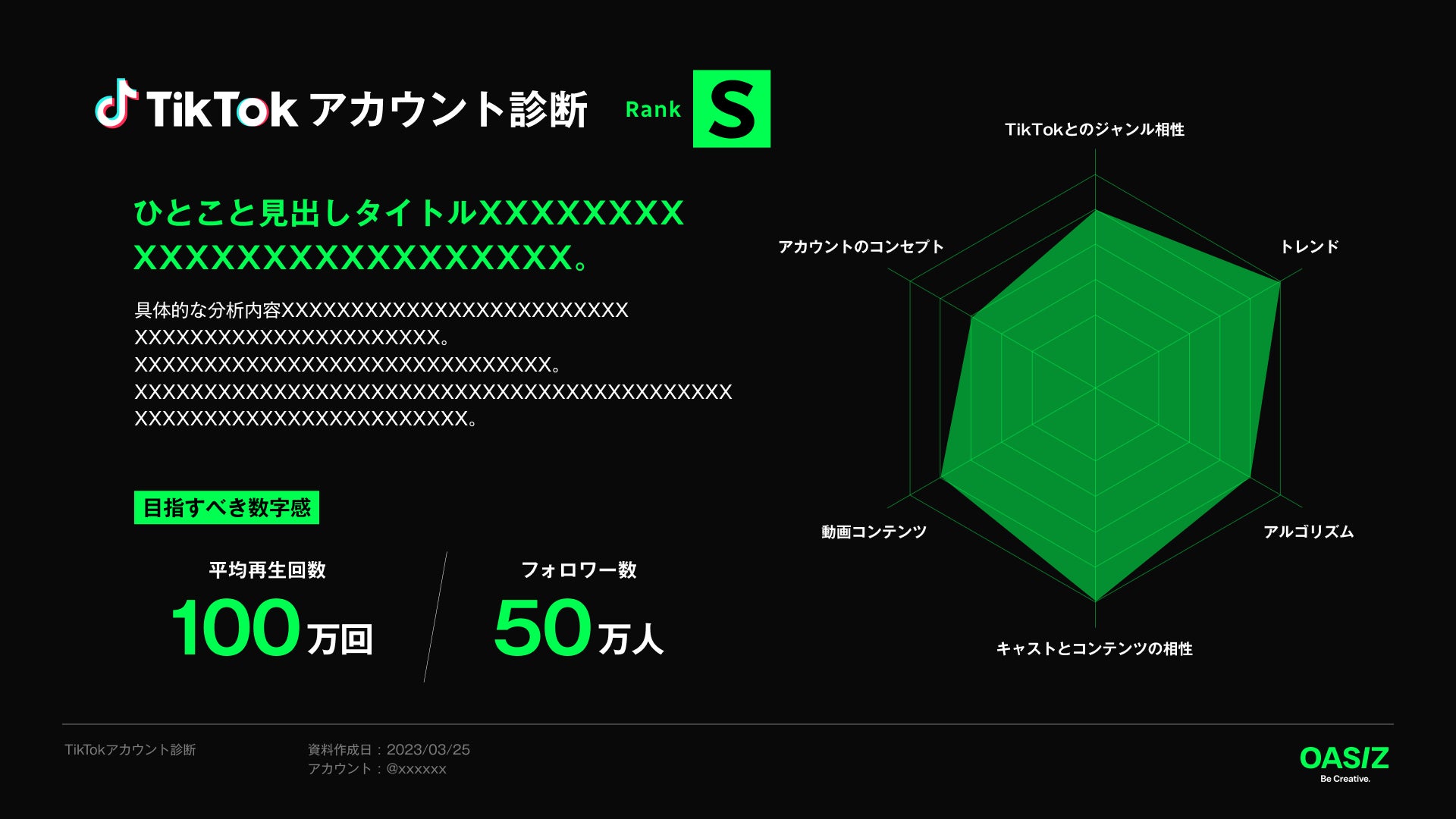 企業様のTikTokアカウントが持つ潜在能力をOASIZ独自分析にて“丸裸”にします。