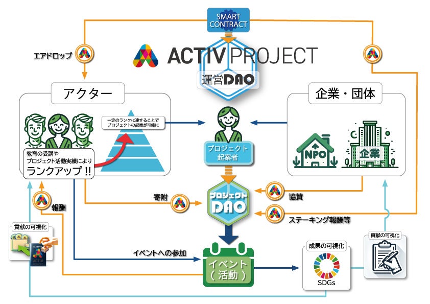 「ACTIV PROJECT」におけるSDGs活動は、DAO(分散型自立組織)として運営されることで、企業やNPO法人を始めとする団体が主催者となり、地域社会や専門家を巻き込んだ透明性の高い活動が可能になります。将来的には、「SDGs to Earn」と呼ばれるトークンエコノミーの実現を目指しており、SDGsへの貢献が報酬につながる仕組みを作ります。このトークンは、2024年中に発行を予定しています。