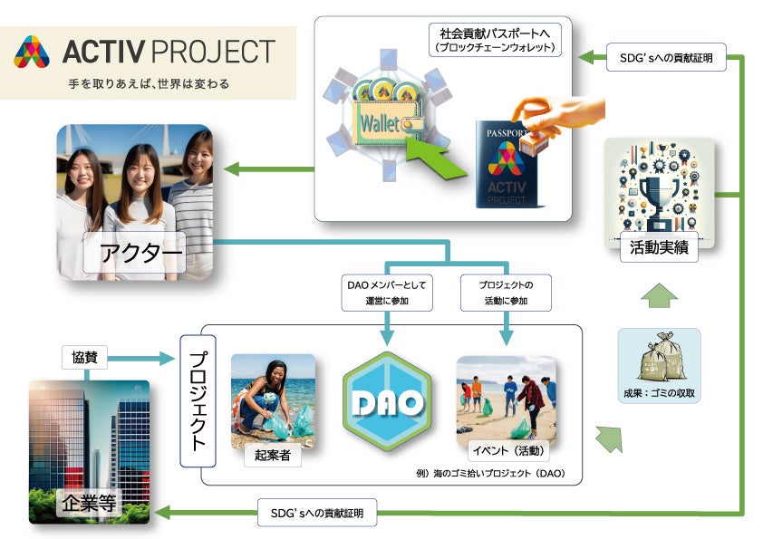 「ACTIV PROJECT」の目的は、「アクター」の創出を通じて、SDGsの裾野を広げることです。このプロジェクトを通して、「アクター」は自身のSDGsへの貢献を「社会貢献パスポート」で記録し、その証として用いることができます。SDGsに関する教育サービスや実際の活動機会も提供され、「アクター」はこれを通して成長することができます。