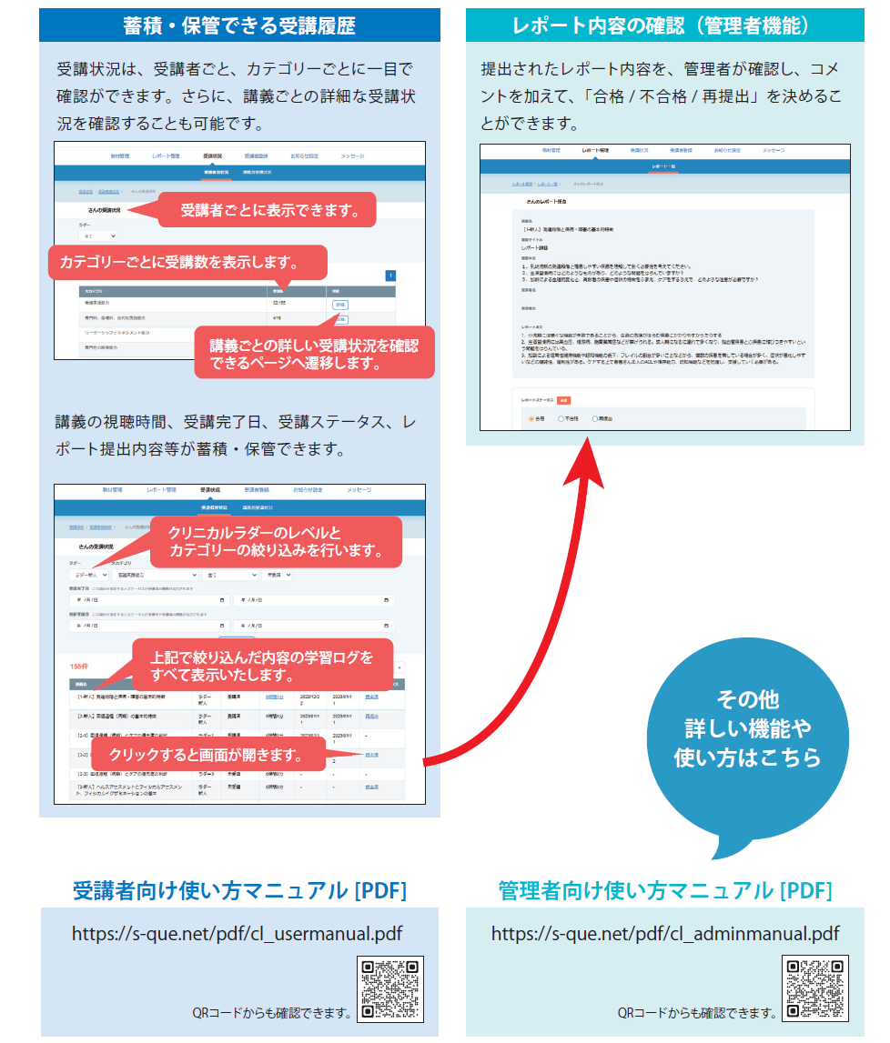 S-QUEクリニカルラダー別研修は受講状況の確認やレポート機能など、便利な機能がたくさんあります。受講者・管理者の負担を減らし、簡単に操作できるのでご活用ください。