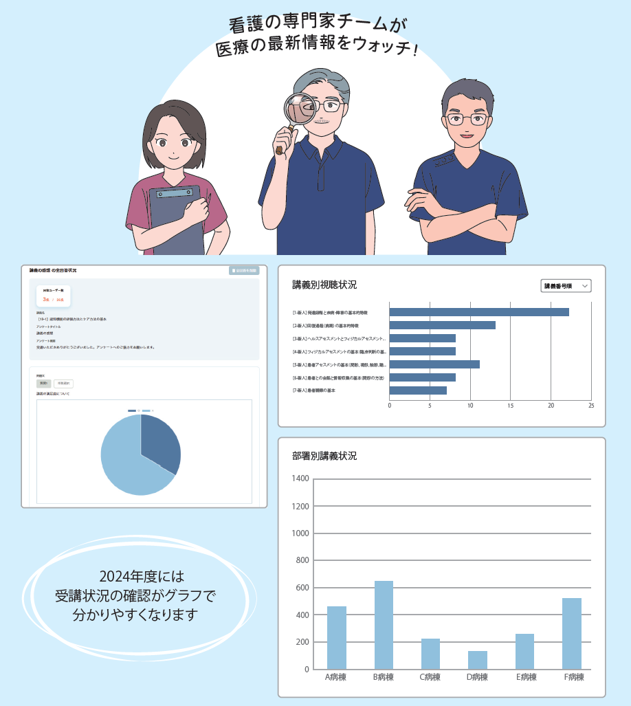 技術の進歩とともに目まぐるしく変化する医療と看護に対応できるように、技術映像、講義棟を最新情報に常に更新しています。また、管理画面では[病院]-[病棟]-[個人]の受講状況をグラフで確認でき、アンケート結果も視える化できるように機能の改良をしております。これにより、より効果的な学習と実践が可能となり、さらに臨床の現場において役立つコンテンツになっております。
