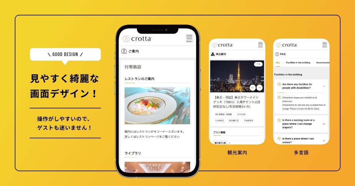 スマホコンシェルジュ「crottaスマホ」フリープランは、スタンダードプランの一部機能を完全無料で利用可能になっています。ゲストスマホ型の客室インフォメーションサービスが単独で無料利用できるのは業界初※の取り組みです。