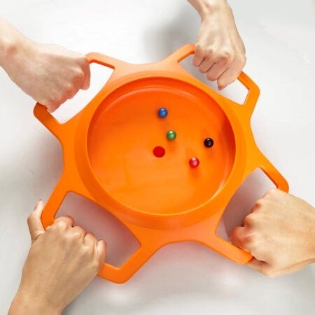 合図と同時に各プレイヤーが自分の持ち球3個のうち1個をフィールドに落とし投入します。 あとは真ん中の穴に自分の持ち球が落ちないようにベースを傾けながら他のプレイヤーの球を落とします。