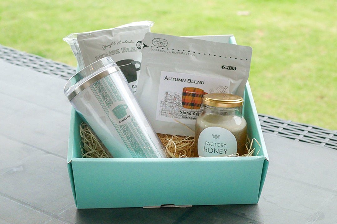 オータムブレンド(100g)、Factory Honey(230g)、博多織タンブラー(白)、コーヒーバッグ(5個)