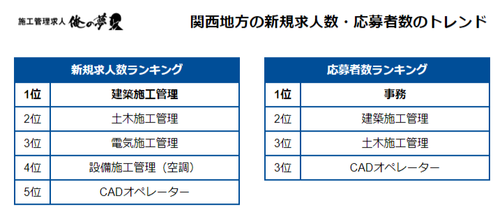 関西地方は、新規求人数では建築施工管理が、応募者数では事務が1番人気となっていました。