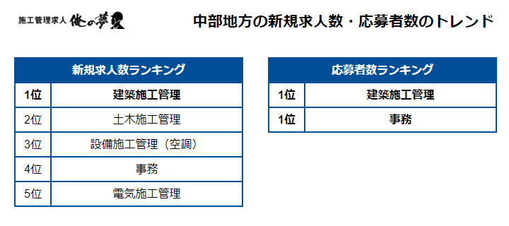 中部地方は、新規求人数・応募者数ともに建築施工管理が1位でしたが、応募者数では事務も同率1位となっています。