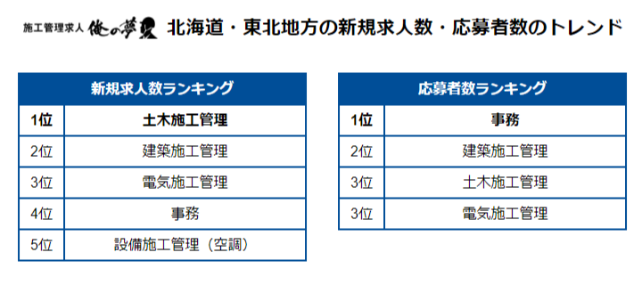 北海道・東北地方は、新規求人数では土木施工管理が、応募者数では事務が1位となりました。