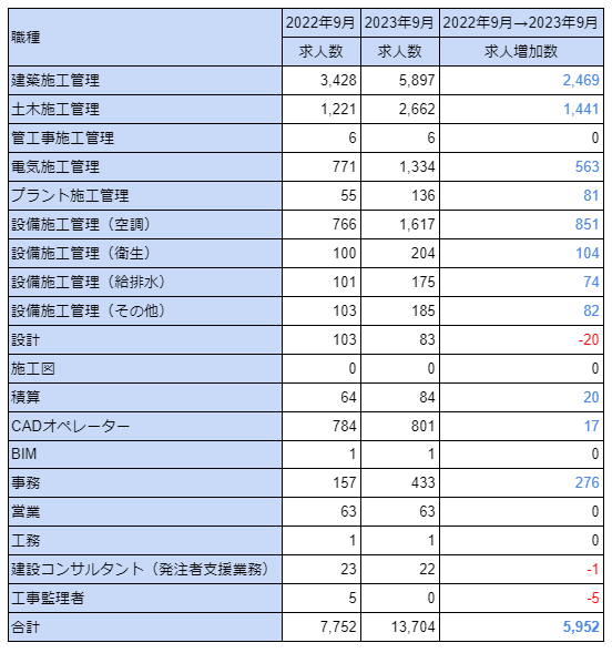 全体的に求人数が増えている中で、増加数が特に多かった職種が建築・土木・設備・電気の施工管理です。