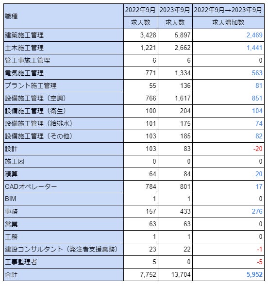 職種別に見ると、建築施工管理の+2,469件を筆頭に、19職種中11職種で求人数が増加していました。