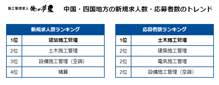 中国・四国地方は、新規求人数では建築施工管理が、応募者数では土木施工管理がトップでした。