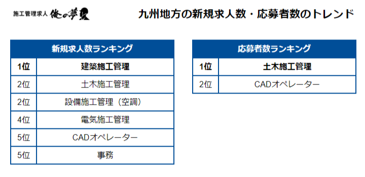 九州地方は中国・四国地方と同様、新規求人数では建築施工管理が、応募者数では土木施工管理が最も多くなっていました。