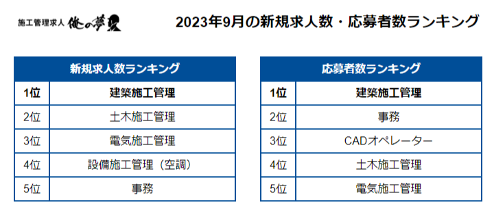 2023年9月は新規求人数・応募者数ともに、建築施工管理が最多となりました。