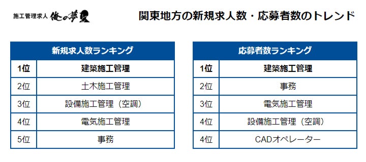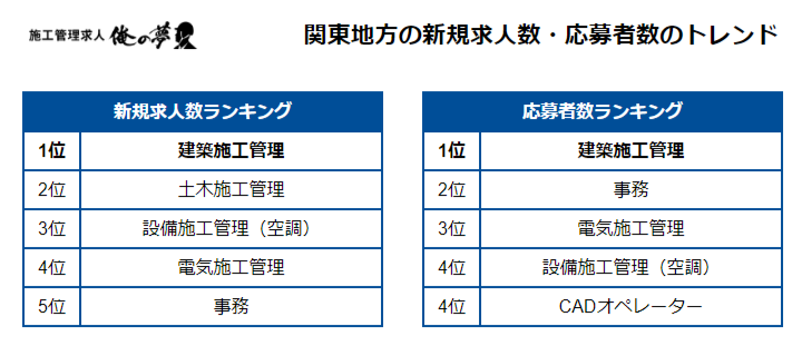 関東地方は、新規求人数・応募者数ともに、建築施工管理が最も多い結果となりました。