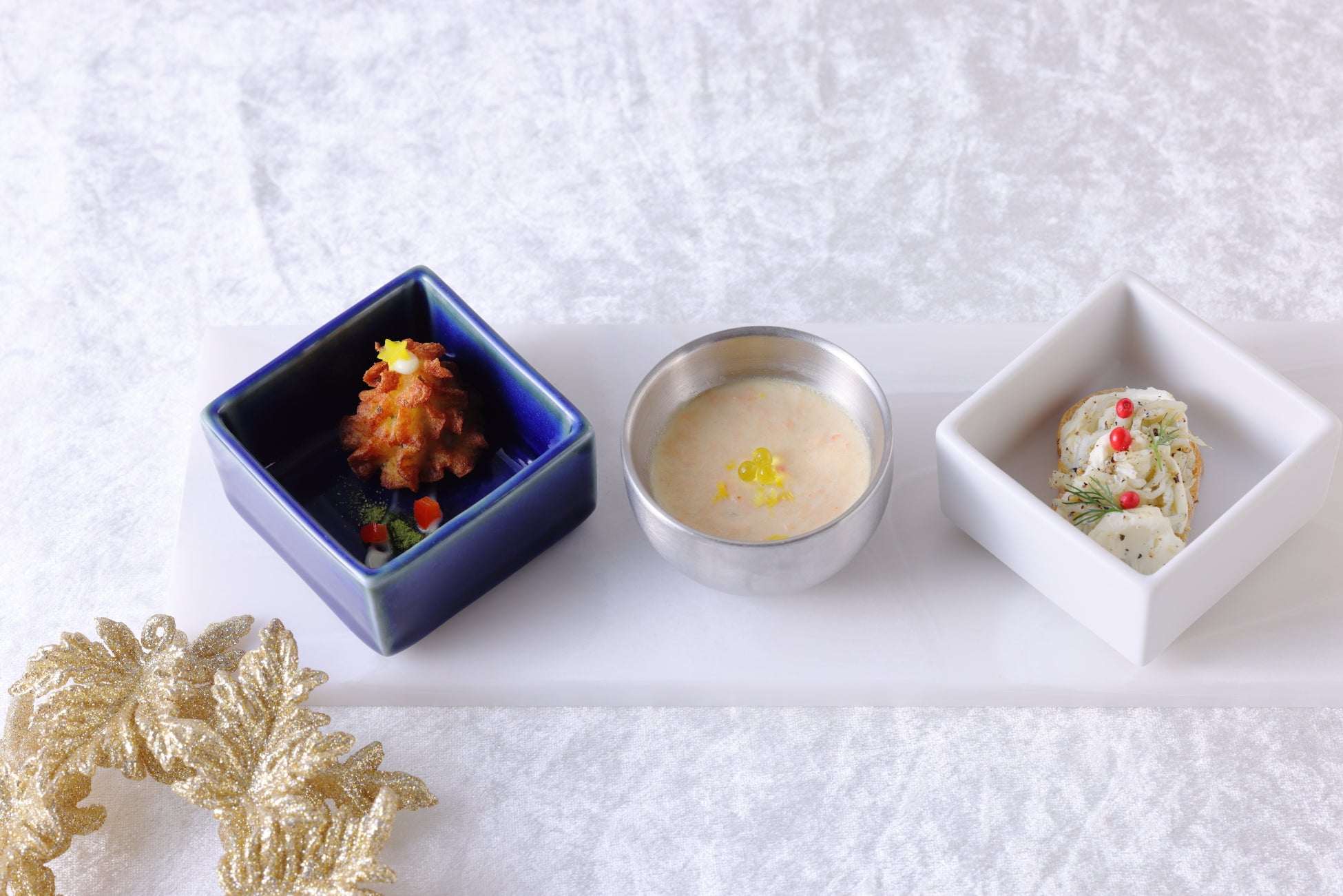 このアフタヌーンティーでは、『トナカイ』、『ホワイトクリスマスツリー』、『サンタの雪帽子』 など、クリスマスの雰囲気を盛り上げるスイーツをご用意しています。また、ホワイトチョコレートやバニラ、パンナコッタなどを用いたスイーツはホワイトクリスマスの純白さを表現し、優しい味わいをもたらします。さらに、3種類のセイボリー(甘くない軽食)は、スイーツとのバランスを考慮した絶妙な組み合わせです。