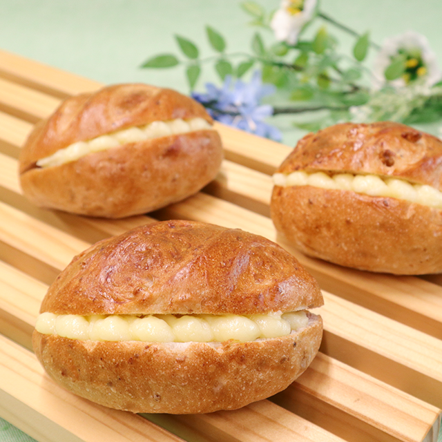 商品特徴:北海道産小麦を使用したフォカッチャ生地の中に、カマンベールチーズを包みました。