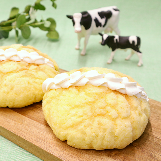 商品特徴:みんな大好き!メロンパンに、さわやかなレモン果汁を加えたクリームをたっぷりとはさみました♪