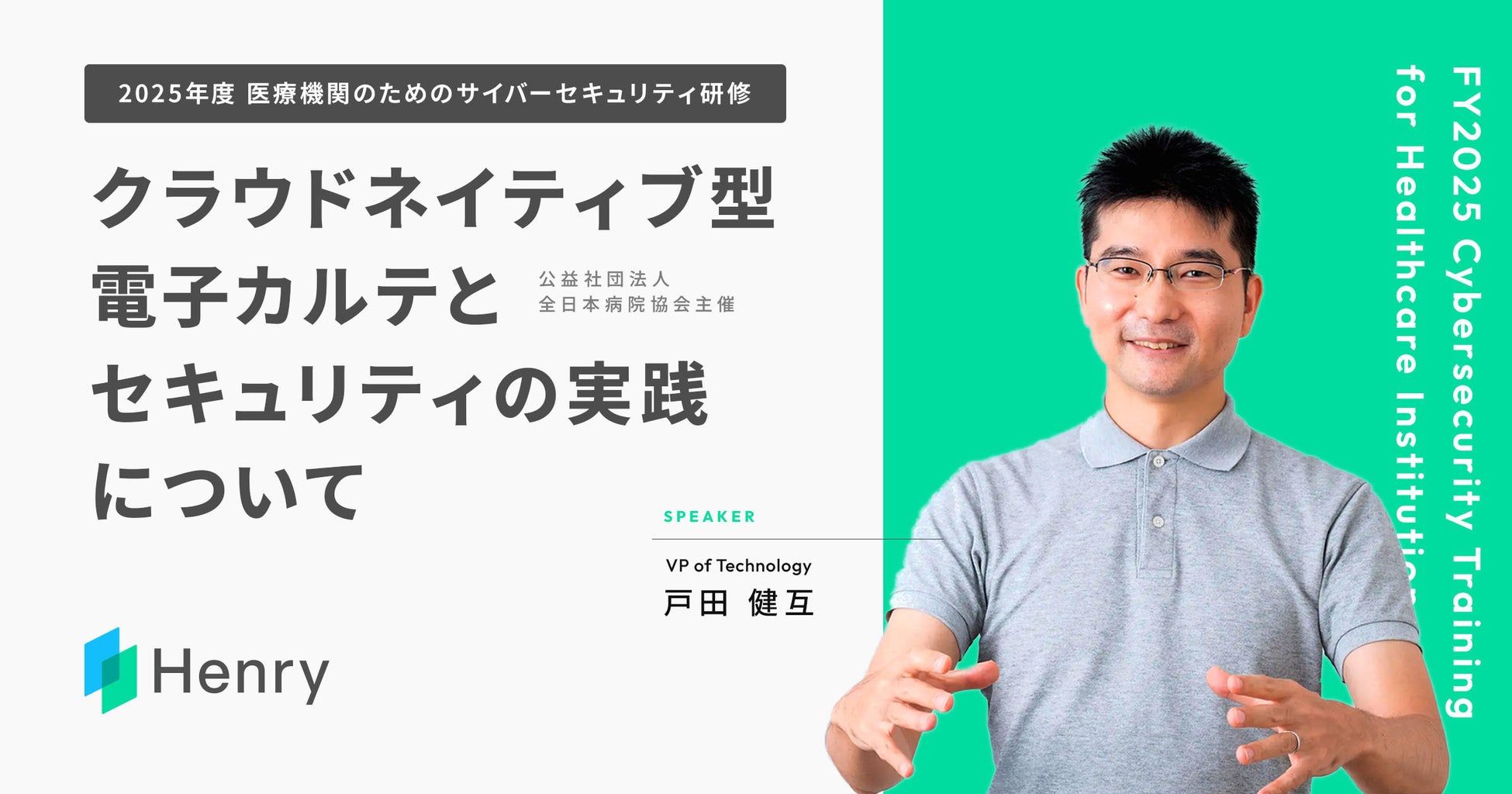 ビジネスを通じた持続的な社会課題の解決を目指し、クラウド型電子カルテ・レセコンシステム「Henry」を提供する株式会社ヘンリー(本社:東京都品川区、代表取締役:逆瀬川 光人、以下 ヘンリー)は、2026年3月5日(木)に開催された公益社団法人 全日本病院協会主催「2025年度 医療機関のためのサイバーセキュリティ研修」に登壇したことをお知らせいたします。当社 VP of Technologyの戸田 健互が、クライドネイティブ型電子カルテにおけるセキュリティの実践をテーマに講演いたしました。
