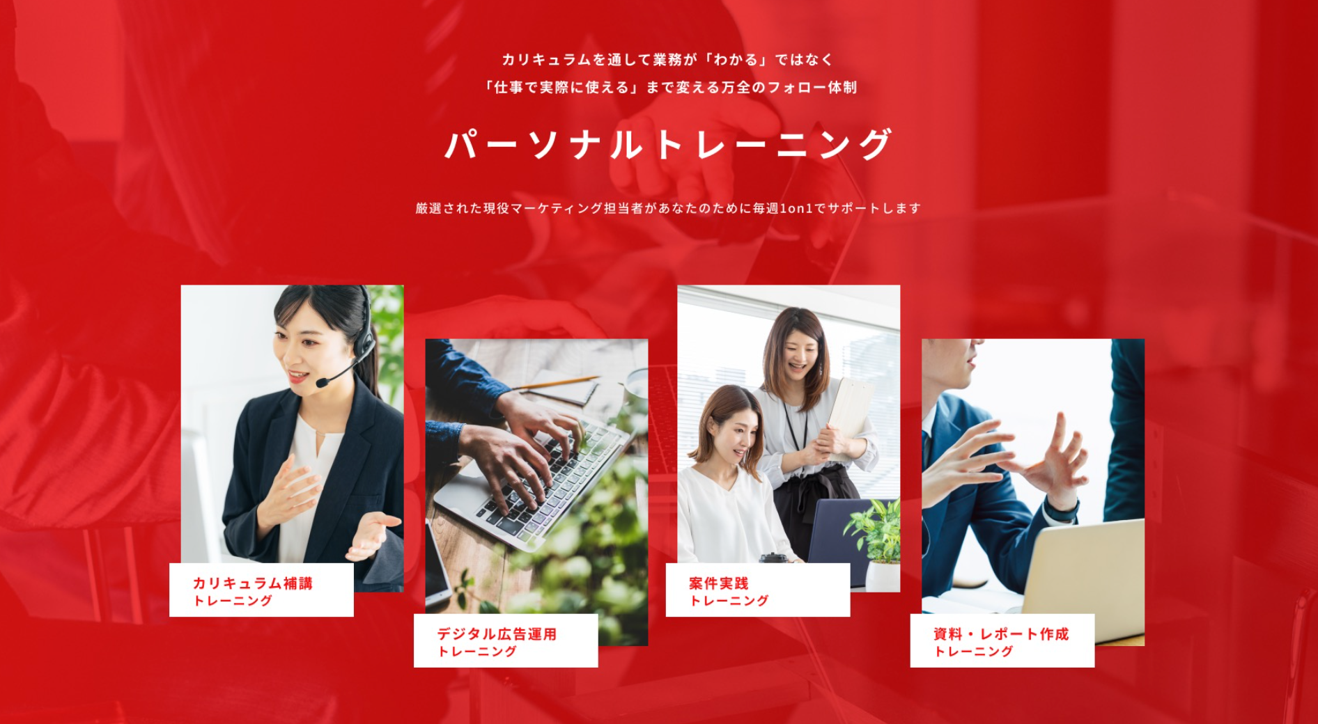 専属トレーナーとの個別トレーニングを提供し、週に1回30分のチケットを発行します。講座内の質問はもちろん、個々のスキルアップに必要な相談やツールの操作方法の指導など、個々のニーズに合わせたパーソナルトレーニングが強みです。