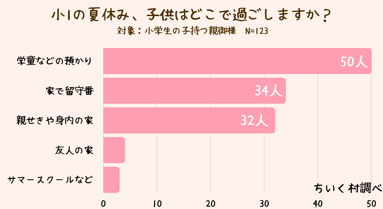 小1の夏休み、子供はどこで過ごすことが多いですか?と聞いてみたところ、123人中50人が「学童」と回答していました。