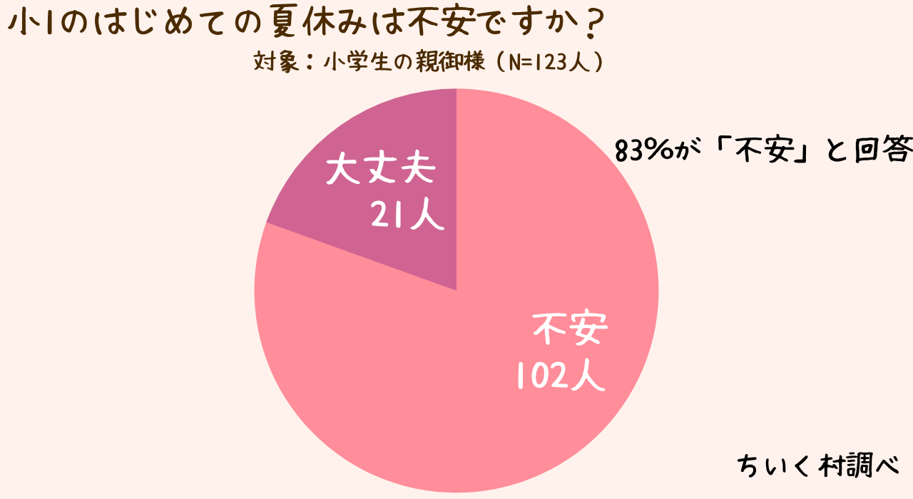 小学生の親御様に「初めての小1の夏休みは不安ですか?」と調査したところ、123人中102名(83% )が「不安」と回答していました。