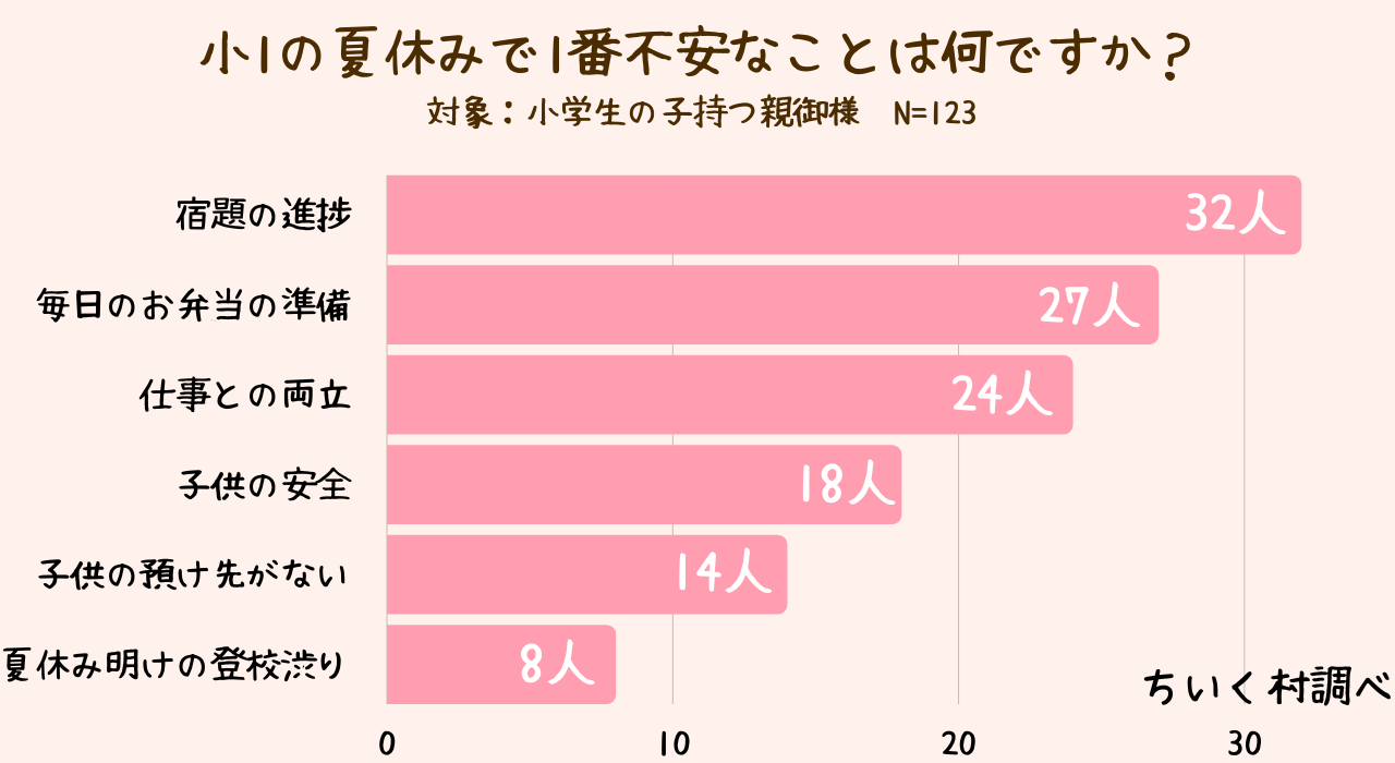 小学生の親御様に「初めての小1の夏休み、具体的に何が不安ですか?」と聞いたところ、123人中32人が「宿題の進捗が不安」と回答していました。
