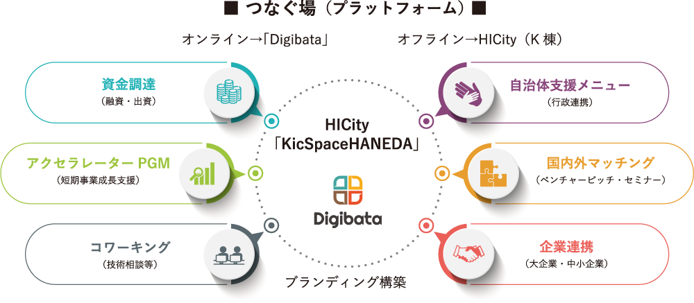 「KicSpace HANEDA」は、羽田空港に隣接し、未来志向の新たな体験や価値を創出するまちづくりを推進するHICityに開設したインキュベーション施設です。その立地を活かし、行政・大企業との連携や国内外マッチングなどリアルとオンラインを融合した6つの機能の提供を通じて、アーリーステージからIPOまでの幅広いサポートを行い、世界に羽ばたくユニコーン企業の創出を目指します。