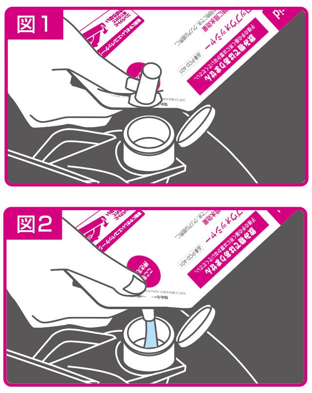 3)注ぎ口をウォッシャータンクに向け、●印から指をゆっくりと離して注ぎ入れてください。液がこぼれないように注意してください。(図2)