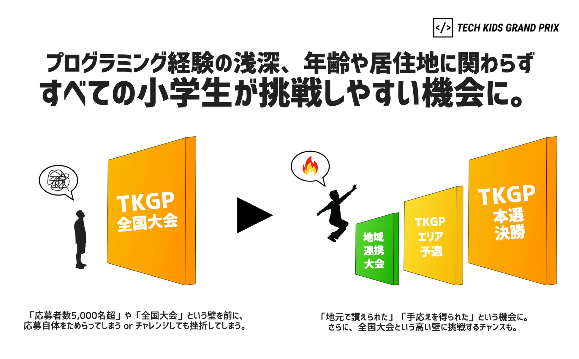 「Tech Kids Grand Prix」は、『21世紀を創るのは、君たちだ。』をスローガンに掲げる、これからの時代を担っていくすべての小学生に向けたプログラミングコンテストです。2018年度の開始より、延べ12,000人以上の小学生が参加している大会です。毎年、熾烈な中間審査を勝ち抜いた上位10名が、東京渋谷の会場を舞台に、自身の作品や、作品にかける熱い想いをプレゼンテーションします。これまでのファイナリストの中には、「Tech Kids Grand Prix」での受賞後、大学教授との学術論文の制作、プロの技術者向けカンファレンスでの受賞、ゲーム制作会社と共同でのオリジナル作品リリース等、さまざまな分野で活躍する人材を輩出しており、次世代を担う人材の登竜門となっております。