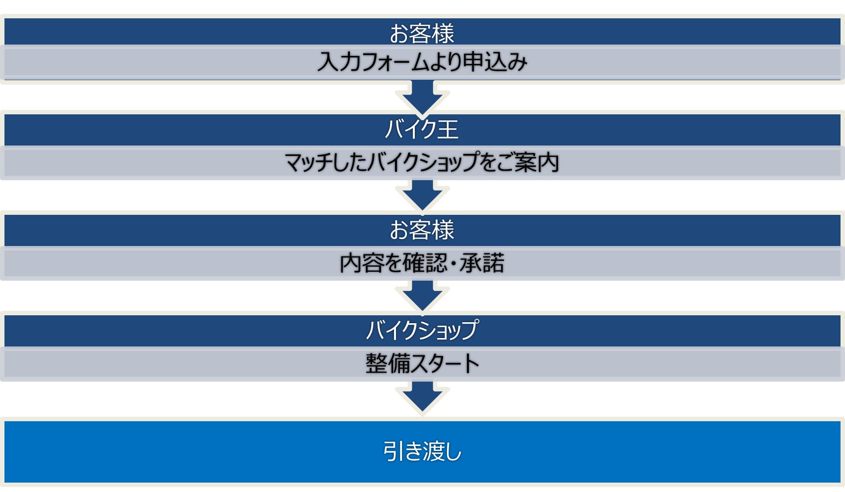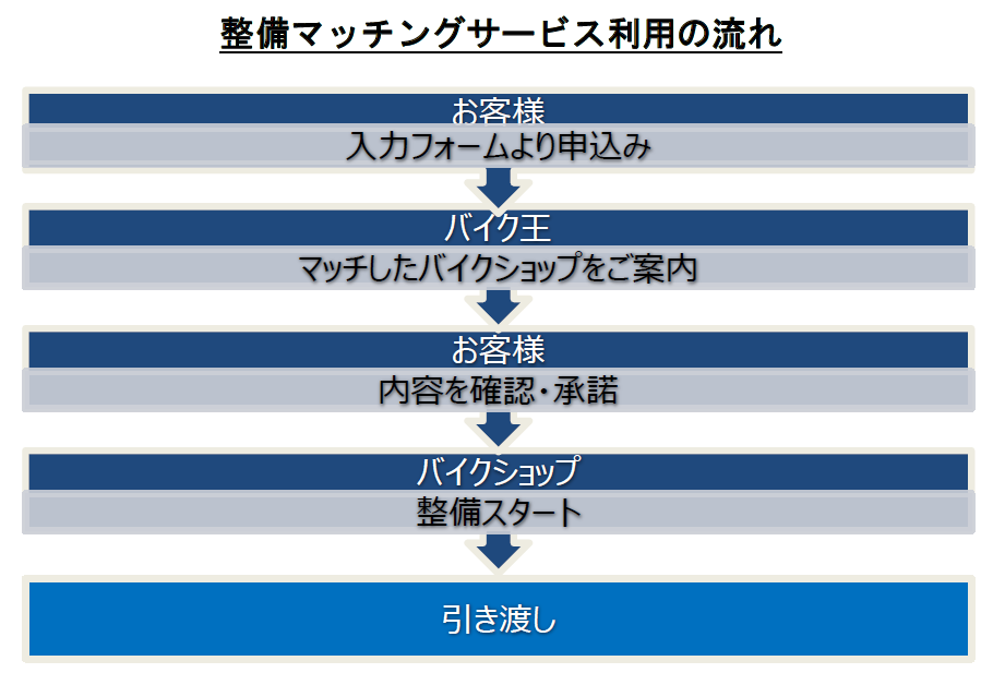 整備を希望する様々なニーズを持つライダーと、それらのニーズを満たすバイクショップをマッチングするサービス。お申し込みは簡単。整備が必要なお客様は、専用入力フォームよりメーカー、車種、排気量、走行距離等を入力するだけでお客様のニーズにマッチした親切・丁寧なメカニックが在籍したお近くの最適なバイクショップを抽出しマッチングいたします。また、お客様の整備やバイクショップに関する不安やお悩みも相談できますので、安心して愛車を任せることができるベストなバイクショップが見つかります。