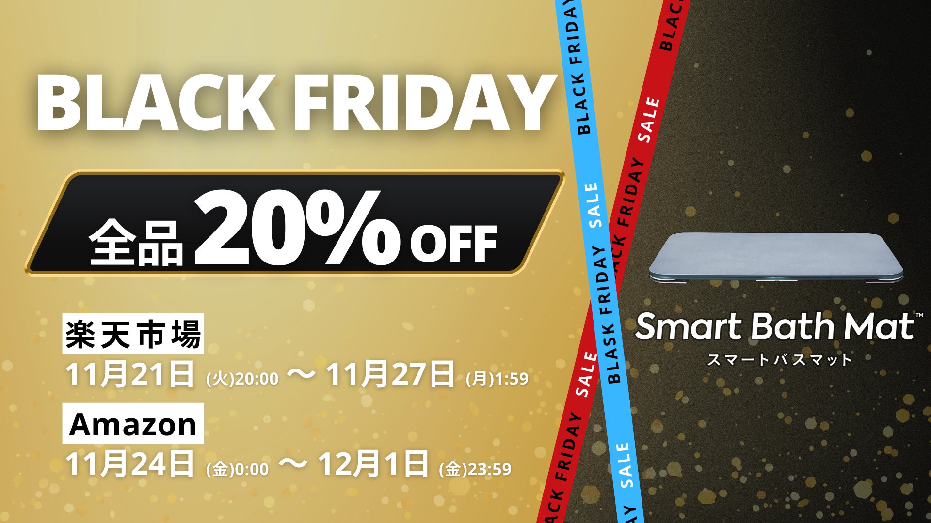 一般発売から1年間の感謝の想いを込め、Amazonおよび楽天市場にて行われるブラックフライデー期間に、「スマートバスマット」が全品20%OFFとなるセールを開催いたします。年末年始の会食シーズンに備えて、体重管理の習慣を身につけましょう。