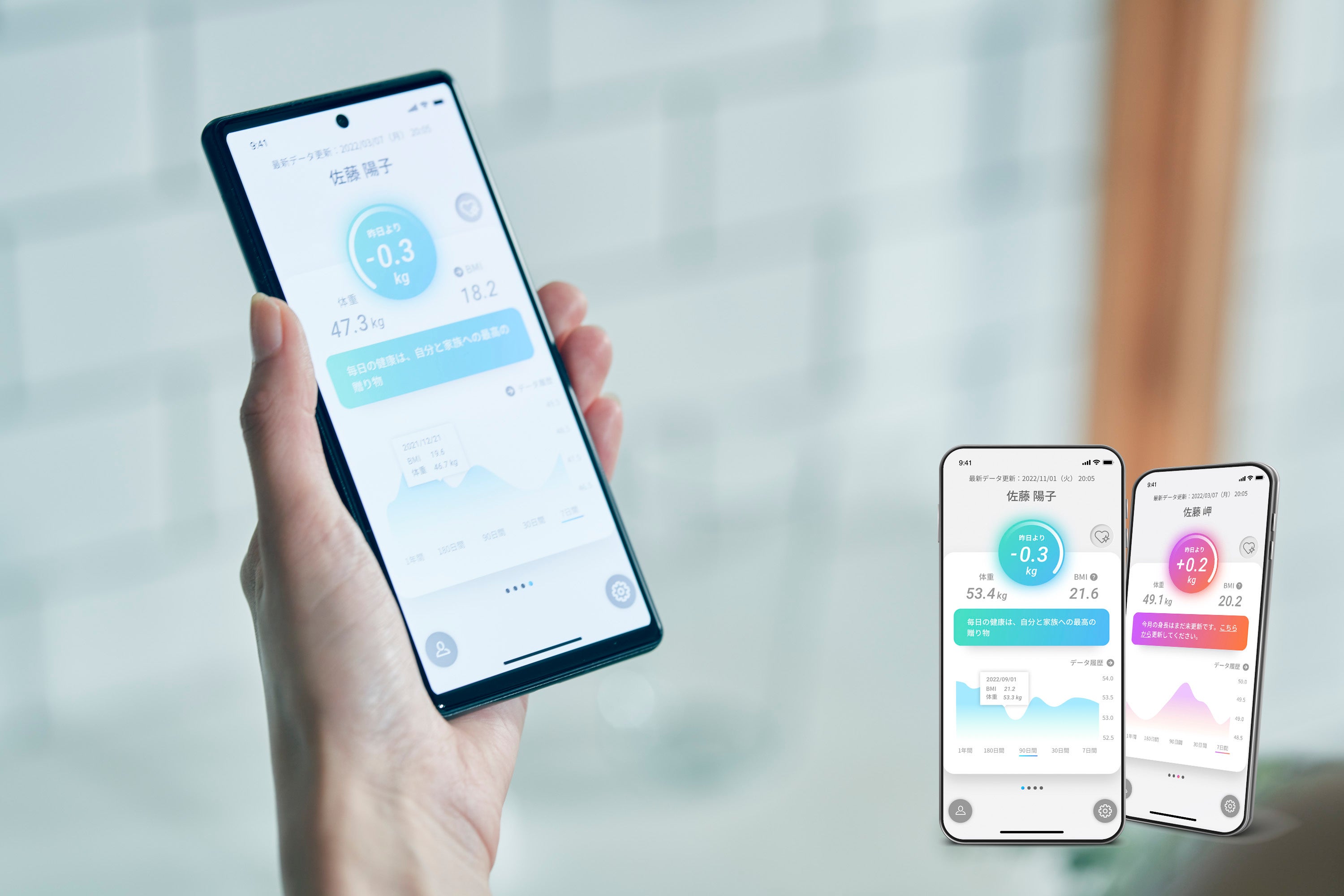 朝晩の測定データを分けてグラフを表示できます。体重測定は、毎回同じ条件で行うことで、小さな変化にも気が付きやすくなります。