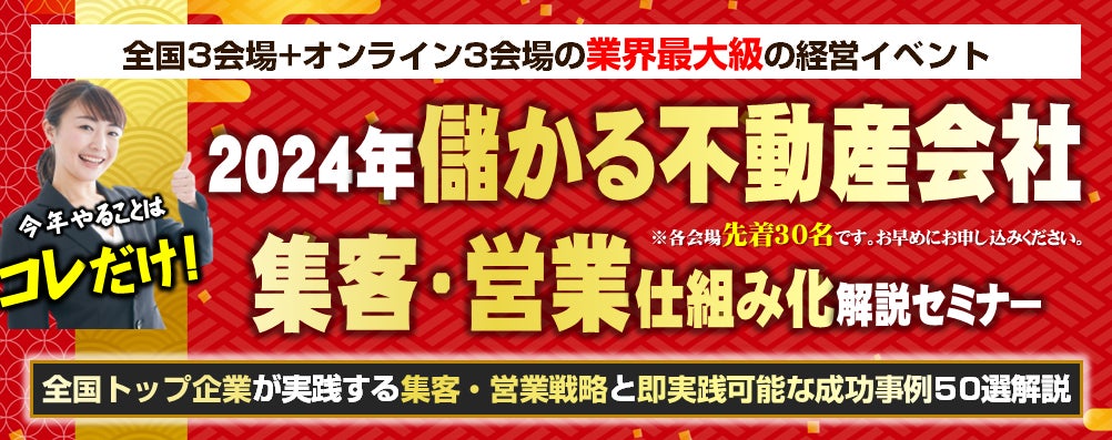 『【全国3会場(オンライン開催あり)2024年儲かる不動産会社 集客・営業仕組み化解説セミナー】』