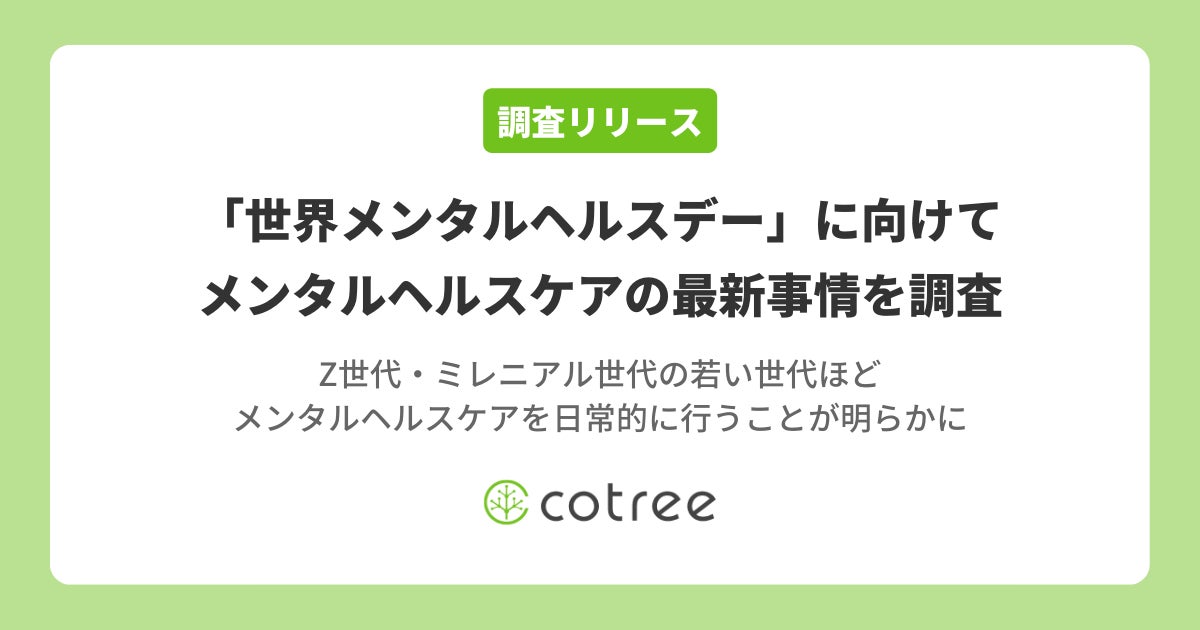 株式会社cotree(本社:東京都港区、代表取締役:西岡 恵子、以下cotree)が提供するオンラインカウンセリングの「cotree」は、「世界メンタルヘルスデー」である10月10日に向けて、メンタルヘルスケアの最新事情の調査結果を発表しました。