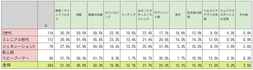 Z世代・ミレニアル世代の若い世代ほどメンタルヘルスケアを日常的に行い、「運動」・「睡眠の改善」を行う人が半数