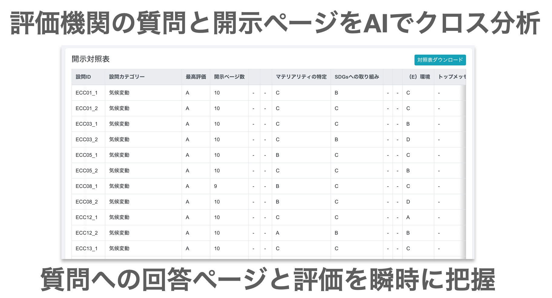 分析が完了すると、勝手格付け機関ごとの質問に対してどのページで開示を行っているのかをクロス分析を行い、一覧化されます。担当者は格付け機関に対して開示該当ページを簡単に把握でき、報告することができます。
