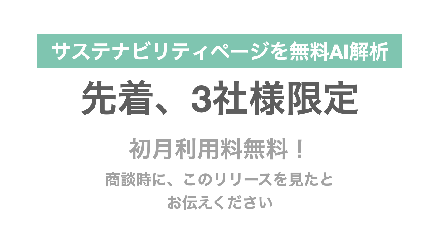 サステナビリティページ分析サービスを提供開始につき、この度特別プランでサービスをご提供いたします。詳しくは、ホームページからお問合せください。