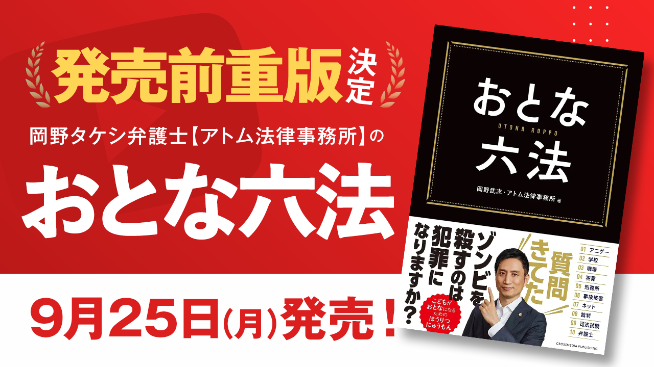 YouTube登録者数150万人超の『岡野タケシ弁護士【アトム法律事務所】』が2023年9月25日(月)に刊行予定の法律入門書『おとな六法』について、予約殺到につき発売前重版が決定しました!