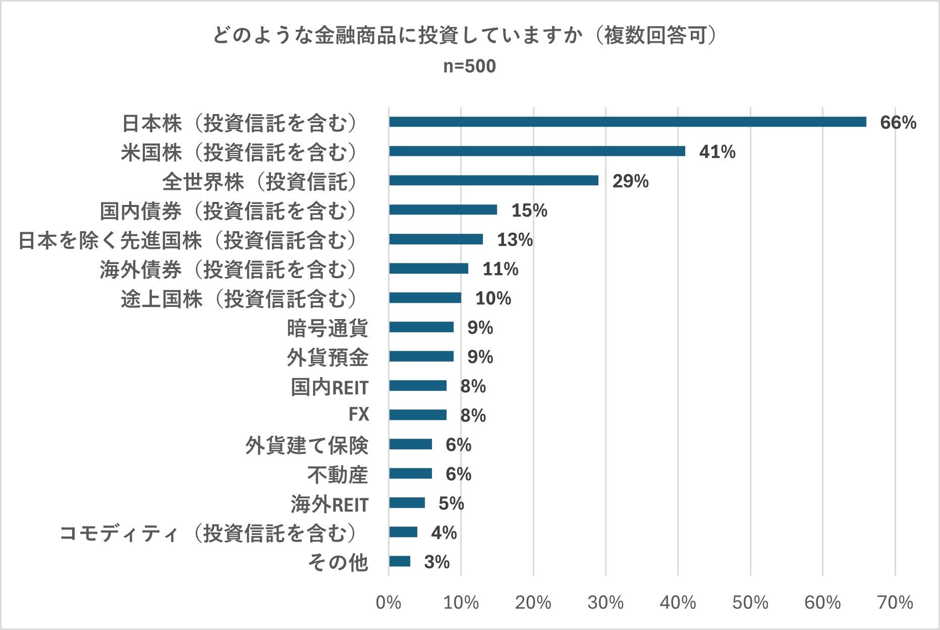 初めに新NISA口座を開設済みの500人に「どのような金融商品に投資していますか」との質問を複数回答可で行いました。その結果、「日本株(投資信託を含む)」が66パーセントで最多となりました。2位には41パーセントの「米国株(投資信託を含む)」、3位は29パーセントの「全世界株(投資信託)」が入りました。以下は「国内債券(投資信託を含む)」(15パーセント)、「日本を除く先進国株(投資信託含む)」(13パーセント)が続きました。